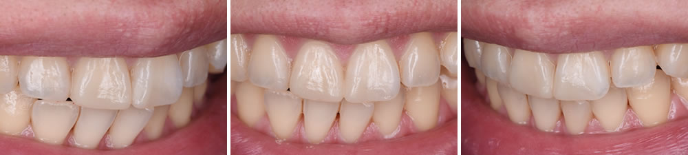 失われた水分量が戻り、レジンと歯の色が問題なく馴染んでいることが確認できました。患者様には大変満足いただけたようで、歯が折れてしまう前の状態は確かにこんな感じだったとのお言葉をいただきました。患者様より少しざらつく部分があるとのことで研磨を行い、咬み合わせの調整を少し行いました。今後は治療部位の破折防止のため就寝時にナイトガード(マウスピース)を製作し使用していただく予定です。