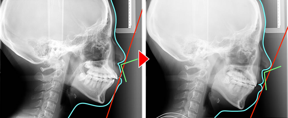 上下顎の前歯の傾斜も唇側傾斜しているため、しっかりと歯軸の改善をしつつ、噛み合わせを治す必要があるため、上下顎小臼歯を抜歯する診断をしました。矯正前・矯正後の横顔のレントゲンからも、口元の突出感、ナゾラビアルアングル(鼻と上唇がなす角度(鼻唇角)のこと。この角度は横顔の美しさの基準の一つで、一般的に90~110度が理想的とされています)の改善、上下顎前歯部の歯軸の改善が確認できました。