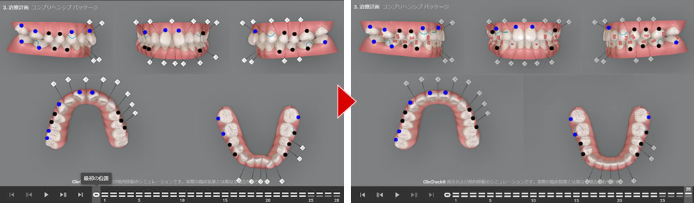 しかし、レントゲンとCT画像を確認すると、親知らずが深い位置に埋まっていた為、抜歯の際の骨の切削量や術後の神経症状の心配がありました。なので今回は、親知らずを抜かずにIPR(歯と歯を0.5mm以内で削ることにより歯の並べるスペースを確保する方法:詳しくはブログをご覧ください>>)を複数個所に適応して、歯の排列スペースを獲得し、インビザラインの設計を作成しました。