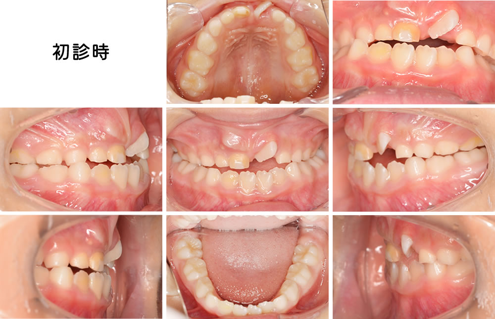 初診時は6歳(現在9歳)の女の子です。「上の前歯が曲がって生えてきた」との主訴で来院されました。上の前歯が曲がって生えることは珍しくなく、特に「翼状捻転(よくじょうねんてん)」と呼ばれる状態です。