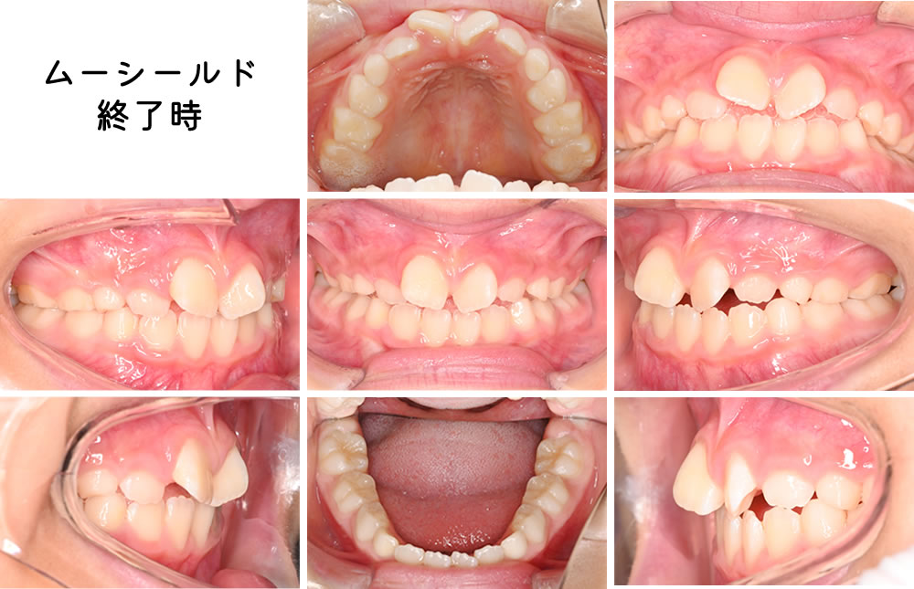 上顎前歯部の歯槽骨の成長が不十分だったため、夜間にムーシールドという装置を使用して、前歯の生え変わりを見守りました。